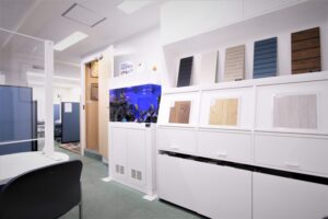 お客様との打合せスペースには、外壁等のサンプルを収納できる棚を新設。