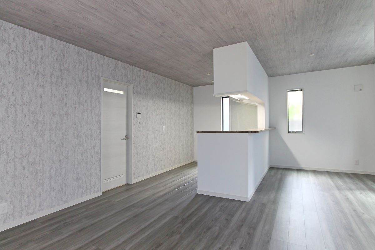 生活感を感じさせないスタイリッシュなリビング。 床と同系色の木目天井が印象的です。 華やかなクロスに囲まれて、日々の暮らしが楽しくなるお宅です。