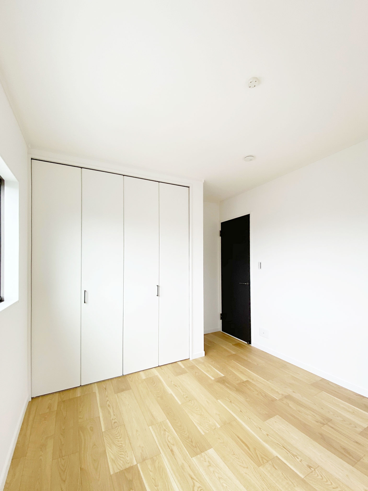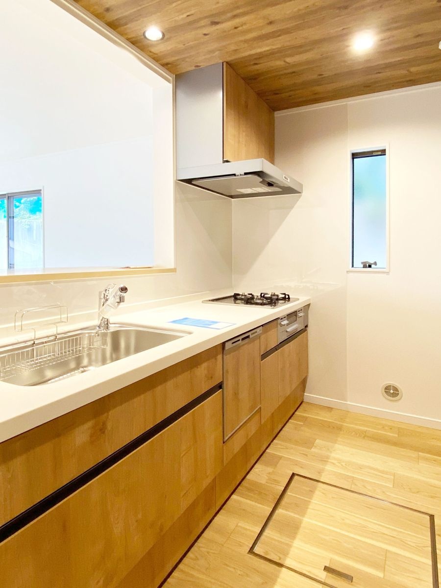 オーク床×木目天井×チャコールブラック建具 が印象的なリビング。 玄関にはタイル風クロス、トイレにはモロッカンブルーのクッションフロアを採用。 どの部屋も見所いっぱいの素敵な空間になっています。