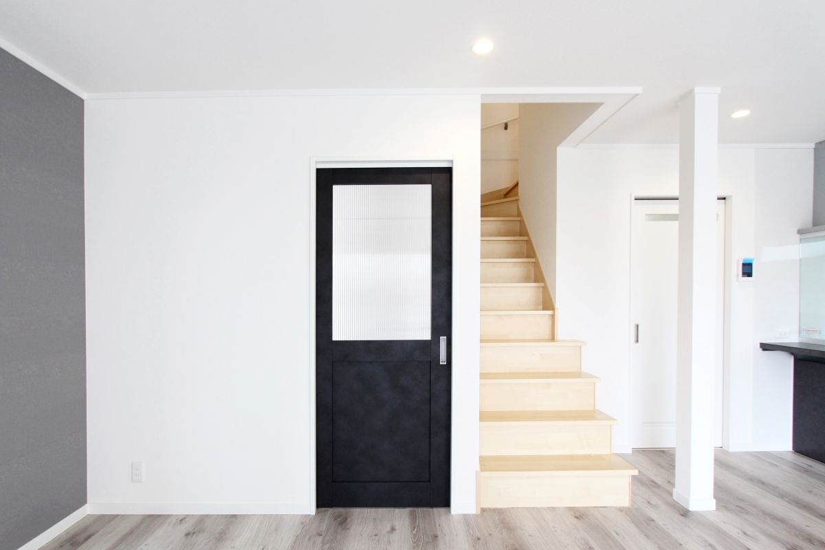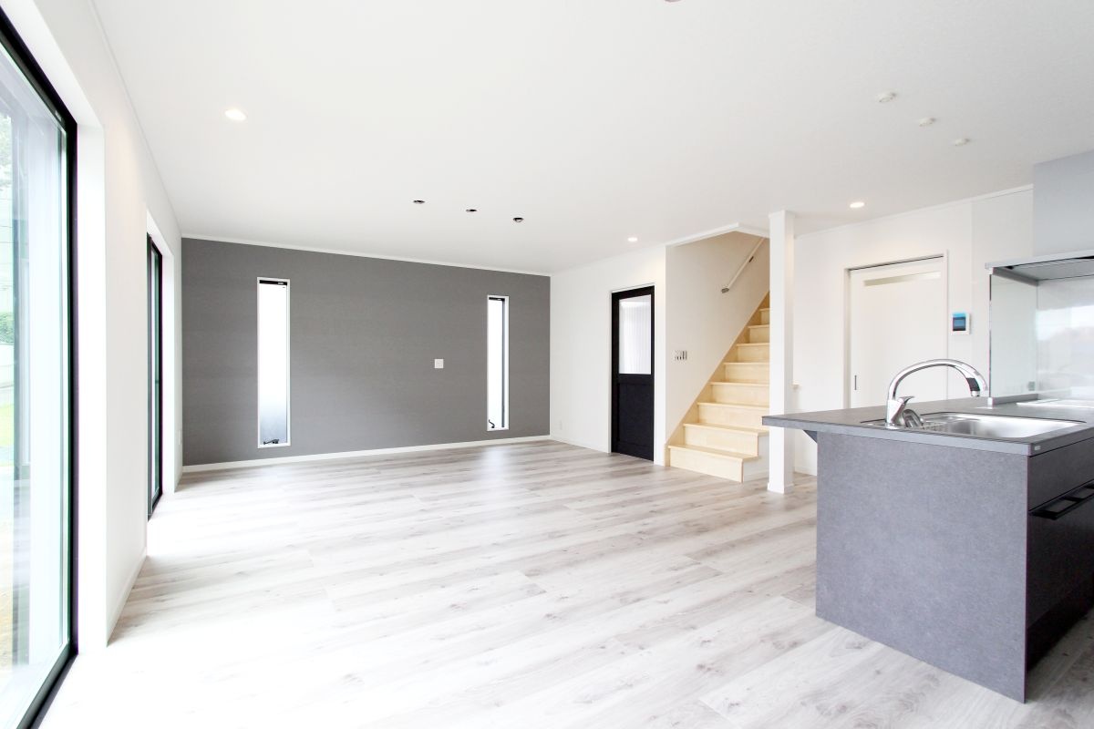ホワイトにブラックのアクセントがスタイリッシュなお宅。 取手も全てブラックに統一したキッチンが印象的です。 掃き出し窓を標準より大きくすることで、 明るいリビングになるよう工夫されています。
